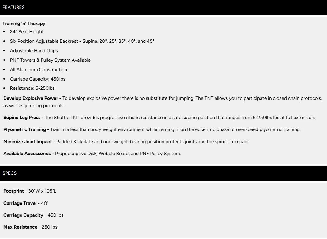 The Shuttle TNT with Towers is a versatile, high-performance Training ‘n’ Therapy system designed for athletes, clinics, and rehab facilities. This all-in-one unit delivers a wide range of exercises, from light rehabilitation and strength training to explosive plyometrics and leg press work. Engineered for durability and smooth performance, the TNT provides professional-grade training and therapy in a single compact system.