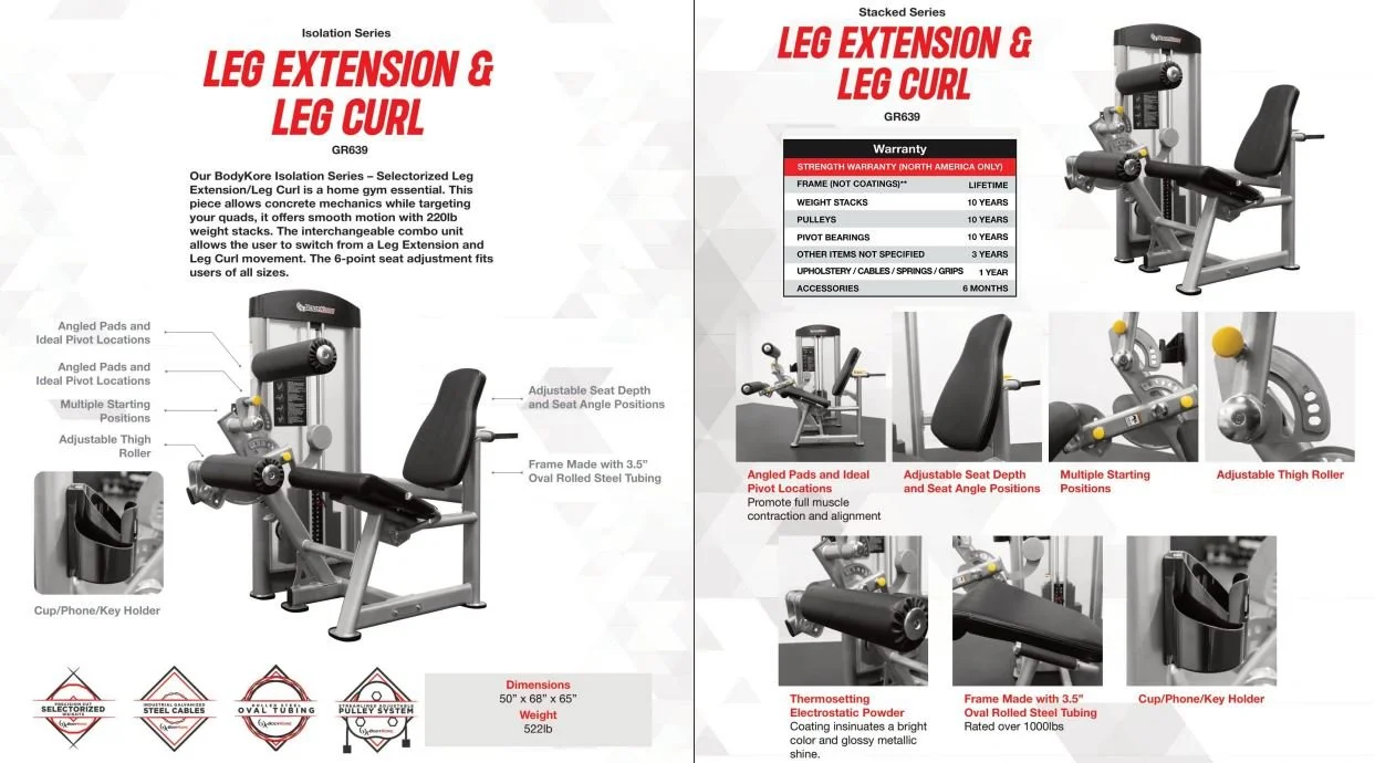 BodyKore Isolation Series – Selectorized Leg Extension/Leg Curl is a home gym essential. This piece allows concrete mechanics while targeting your quads, it offers smooth motion with 220lb weight stacks. The interchangeable combo unit allows the user to switch from a Leg Extension and Leg Curl movement. The 6-point seat adjustment fits users of all sizes. This machine is commercial grade and rated to hold over 1000lbs.
